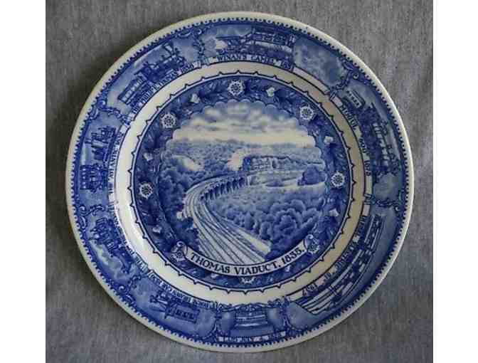 The railroad commissioned these blue transferware plates to celebrate its 100th anniversary (1829-1929). They were produced by the Lamberton Company. This 6 3/4" diameter plate depicts the Thomas Viaduct over the Ptapsco River near Washington, D.C., built in 1835. The Back is stamped 1827 - 1927 Baltimore & Ohio Railroad, Scammell's Lamberton China Patented.