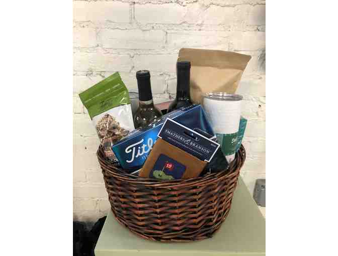 Basket includes 2 bottles of wine, a silk scarf, Callands coffee and 2 cups and many other goodies.