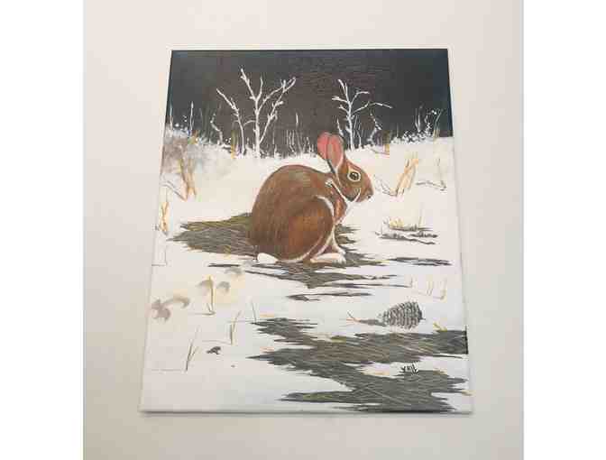 This oil and acrylic painting of a rabbit in winter was produced by talented local artist Vicky Hines. The unframed paintng measures approximately 16" x 24" and will delight wildlife and rabbit fanciers.