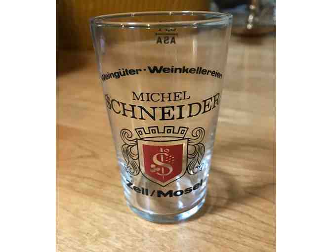 Enjoy your German white wine or any beverage of your choice in this set of 14 stemless Michel Schneider Zell/Mosel wine tasting glasses (or wine tumblers, if you prefer). Michel Schneider is a popular winery in the middle Rhine region of Germany. Each glass has the Michel Schneider logo and stands about 4" tall with red and black printing and volume fill line.