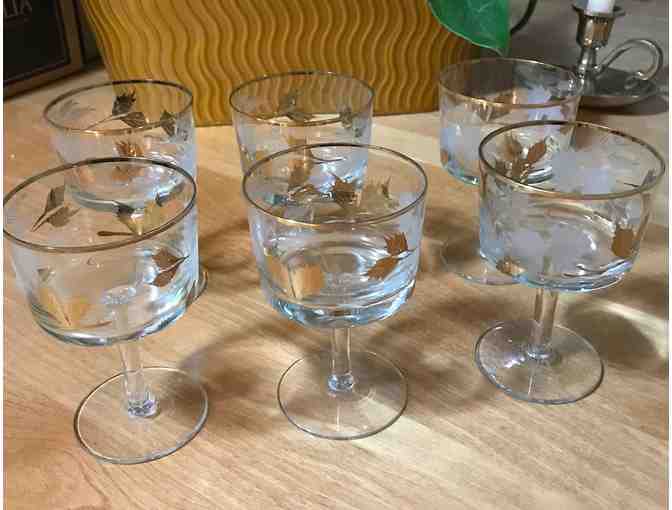 A beautiful vintage set of six stemmed cordial/aperitif glasses with gilt rims and leaf decorations enhanced by etched leaves. Each glass is approximately 4" tall. Add elegance to your table or bar with these beauties. They would also be perfect for a decadent dessert service.