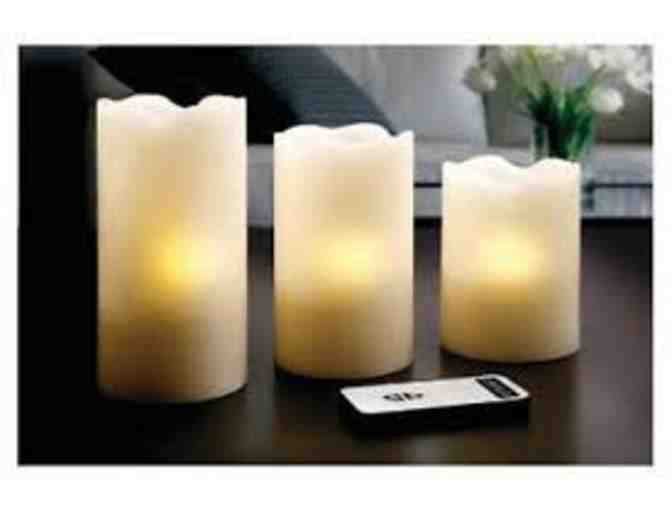 Set of 3 flameless LED candles made with real wax. Candles flicker to create soft, ambient light anywhere in your home.