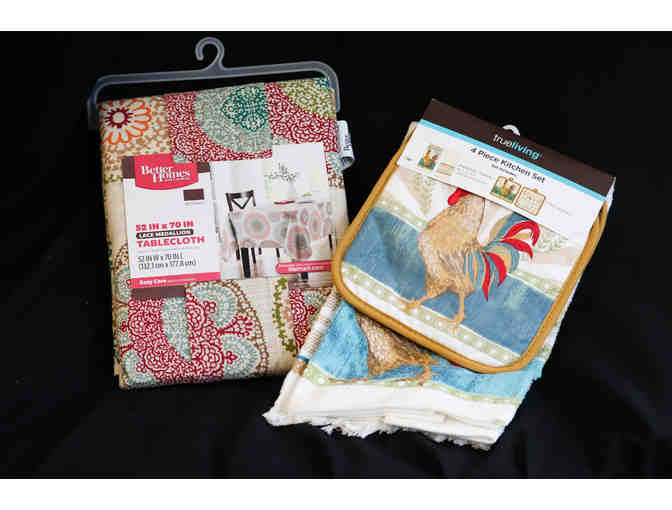 Turquoise, brown and red color coordinating set. Lace medallion design table cloth and roosters and cows on the pot holders. Very homey!