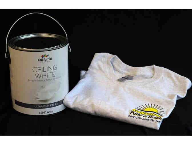 One gallon of California white ceiling paint. Ultra Flat Finish. Extra Large Sunshine Paint and Brush T Shirt.