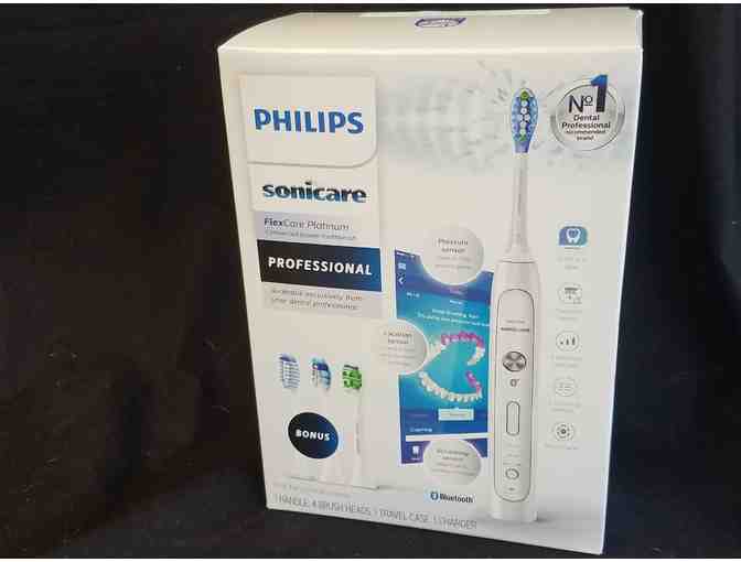 Sonicare FlexCare Platinum Proffesional Toothbrush has smart sensors that track your brushing and send data to your app via bluetooth. Comes with a delux travel case and travel charger. Has four brush heads and four hygenic caps.