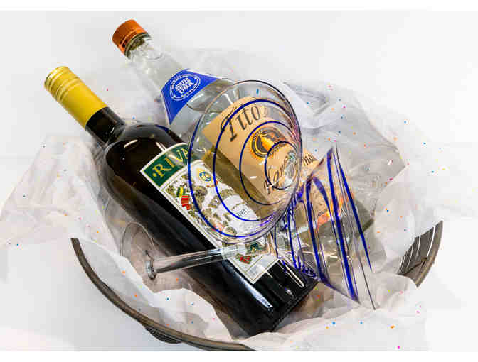 This package includes a 1L bottle of Tito's Vodka, 1L of Dry Vermouth, and 2 stunning, blue swirl martini glasses in a wire bowl.