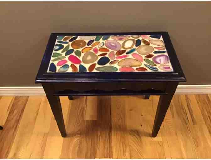A one of a kind ‘drab to fab’ remake of an end table. It has real slices of geodes embedded in resin. It is dark blue with distressed areas of electric blue, highlighted with gold accents.