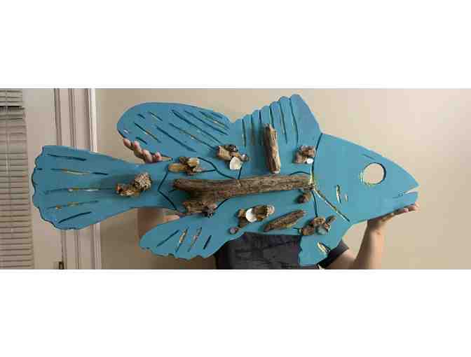 To view additional photos of artwork, please view this website from a computer (the phone/mobile site shows only one photo). No refunds or returns. Winner will pay an additional $10 processing fee on top of winning bid. Item can be picked up in Beverly, MA, or we can arrange for shipping to be paid at Buyer’s expense. We will get in touch with the winning bidder after the auction closes to arrange for pickup/delivery in Beverly. Weighted stands available separately for $45. Please contact hwolsey@beverlymainstreets.org to inquire about shipping a Bass or purchasing a stand. Please note - the back of the Bass has drill marks from the mounting hardware used during the outdoor exhibit. This Bass is heavy - it weighs more than other pieces due to the attached driftwood.