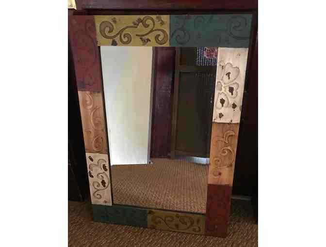 Mirror framed in muted greens, reds, golds and ivory.