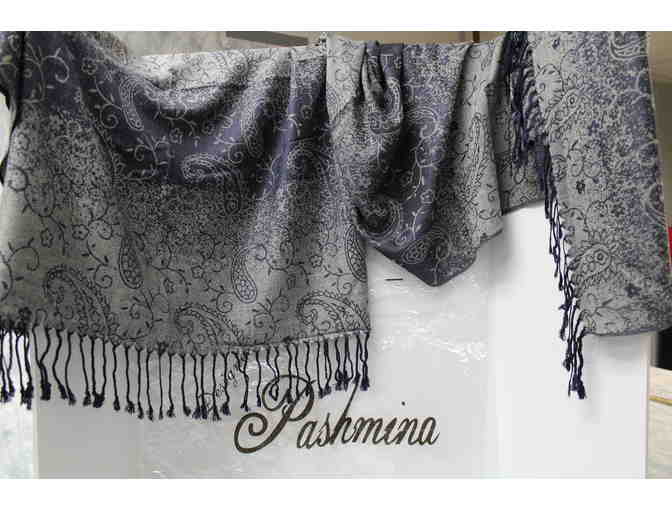 Enjoy this beautiful navy blue and white, paisley pashmina scarf/shawl.