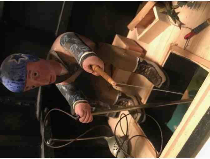 A unique artpiece! A replica of a Northern Michigan Ice Shanty with a hand carved ice fisherman and fish, handcrafted ice fishing equipment and shanty.