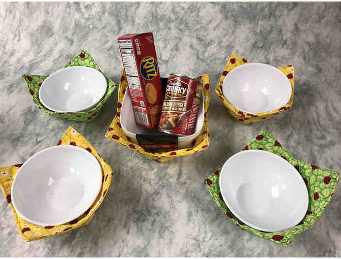Protect your items with this set of five (3 yellow and 2 green) bowl/pan dividers made and donated by local seamstress Rosie Mercer. Dividers also work great as potholders. This package includes the bowls and food items shown.