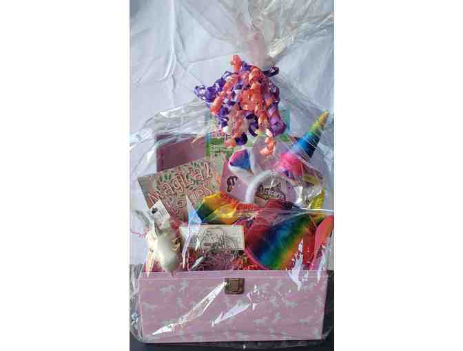 Pink unicorn chest includes an assortment of unicorn-themed items: