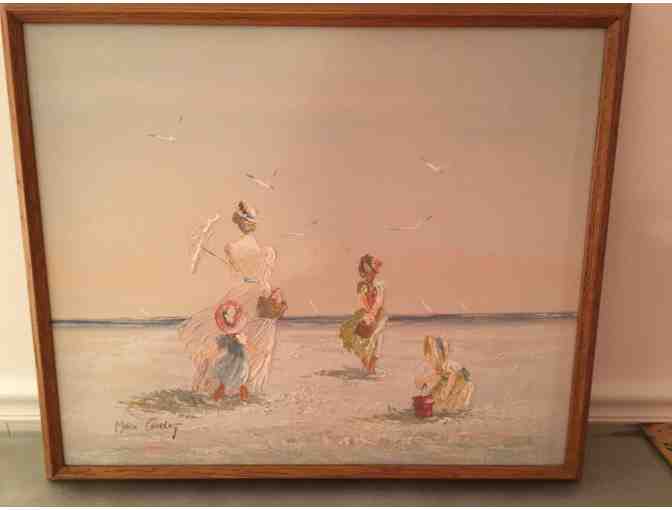 Oil painting by artist Marie Clarlot showing a mother and her children spending a day at the beach.