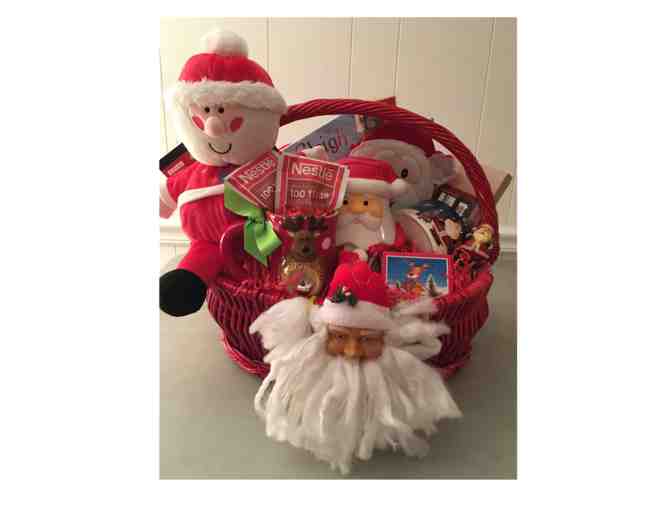 Large red basket with Santa everything - glass cookie jar with cookies, stuffed Santa, dip, bowl and spreader, book, mug and a lot more Santa fun