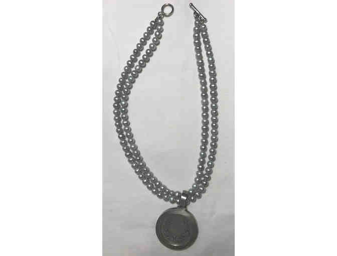 French Kande necklace in silver pearls and medallion. The pearls are 17" long and the medallion is 2". Original cost was $395.