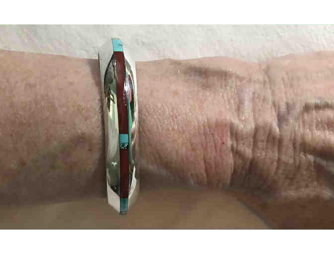 Zuni Native American cuff in silver with turquoise and coral inlay.