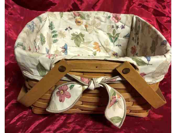 This is a 2009 Longaberger Cake Basket w/Swing Handles, with Liner 12"L 12"W 6"H! The basket has been pre-owned.