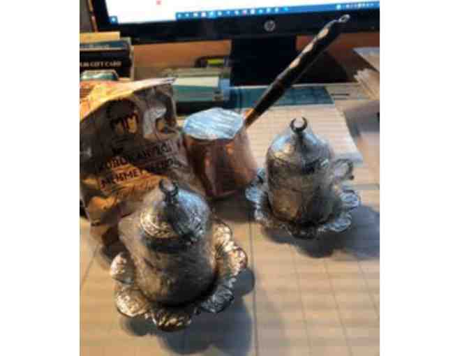 NEW! Authentic Turkish Copper Coffee Pot with 2 Silver Coffee Cups & Saucers. Includes one package of Turk Kahoesi.