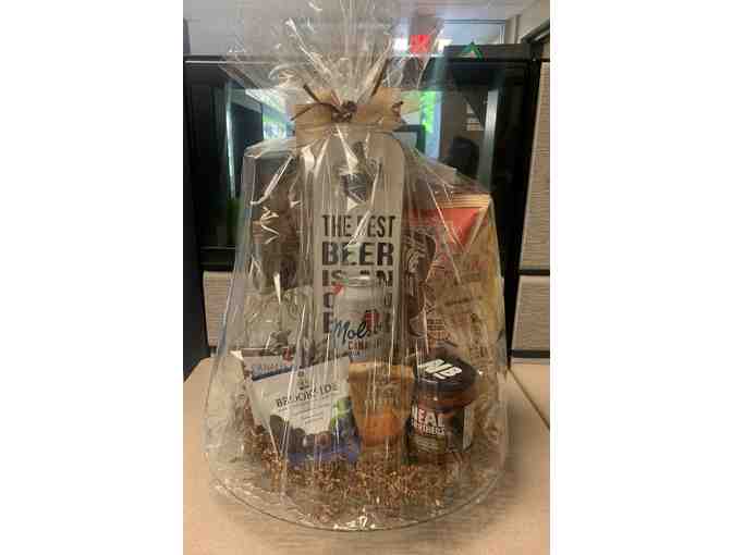Beautiful gift basket complete with beer, chips, dips, beer accessories, picture frame and more all set on a stunning glass platter.