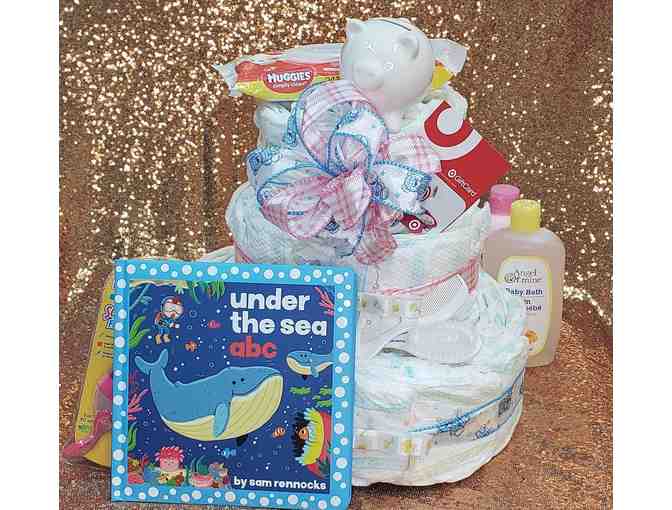 If you've gotten a baby shower invitation, we've got the gift ready to give. This baby basket takes the cake with a diaper tower, wipes, lotions, shampoos, infant comb set, piggy bank and a $25 Target gift card for the new parents.