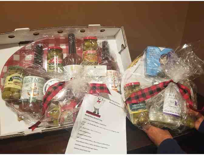 This basket featured 3 flavors of locally made Rusty Anchor Bloody Mary Mix, Gray Duck Vodka which is distilled in MN, Feta cheese, Bleu Cheese, Garlic & Jalopeneo stuffed olives, Pickle & asparagus spears and a stainless steel pickle fork all bundled up in 2 cute baskets!