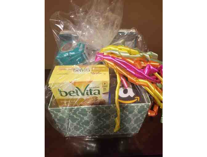 This coffee & technology basket is perfect for working from home, featuring 3 flavors of coffee, 2 coffee mugs, cookies and a $25 Amazon Gift Card!