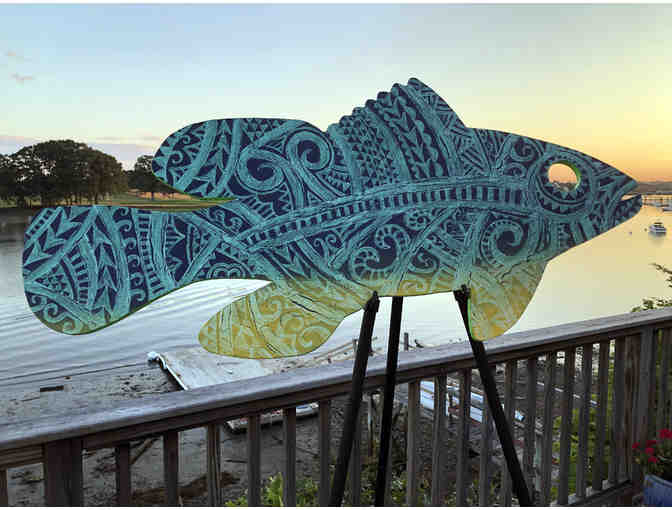 To view additional photos of artwork, please view this website from a computer (the phone/mobile site shows only one photo). No refunds or returns. Winner will pay an additional $10 processing fee on top of winning bid. Item can be picked up in Beverly, MA, or we can arrange for shipping to be paid at Buyer’s expense. We will get in touch with the winning bidder after the auction closes to arrange for pickup/delivery in Beverly. Weighted stands available separately for $45. Please contact hwolsey@beverlymainstreets.org to inquire about shipping a Bass or purchasing a stand. Please note - the back of the Bass has drill marks from the mounting hardware used during the outdoor exhibit.