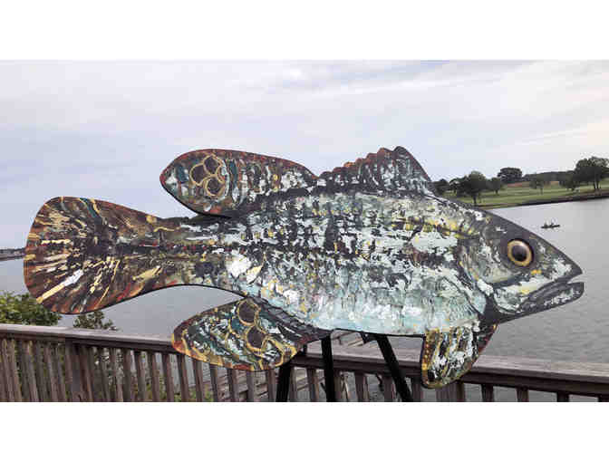 To view additional photos of artwork, please view this website from a computer (the phone/mobile site shows only one photo). No refunds or returns. Winner will pay an additional $10 processing fee on top of winning bid. Item can be picked up in Beverly, MA, or we can arrange for shipping to be paid at Buyer’s expense. We will get in touch with the winning bidder after the auction closes to arrange for pickup/delivery in Beverly. Weighted stands available separately for $45. Please contact hwolsey@beverlymainstreets.org to inquire about shipping a Bass or purchasing a stand. Please note - the back of the Bass has drill marks from the mounting hardware used during the outdoor exhibit.