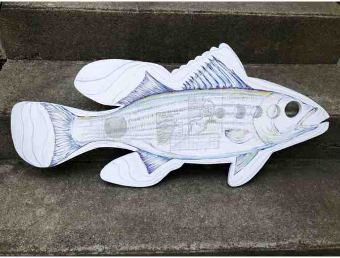 Materials: Bass is 3ft x 1.5ft and made of .5in Kleer (PVC). Pencil, ink and acrylic paint.