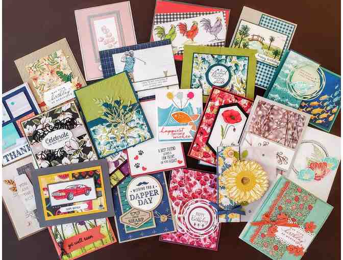A collection of 25 cards with envelopes hand crafted by Ginny Harrell.