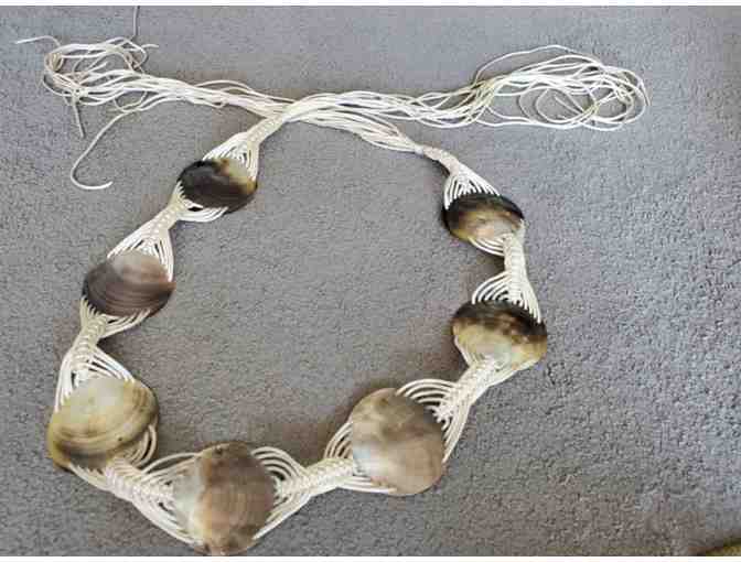 Seashell Belt: A beautiful decorative belt made of seashells and intricately woven rope. Shells have a mother-of-pearl color and the rope is a soft off-white. Length is approximately 70” overall, and 32 inches between the two end-most shells. Definite polynesian vibes!