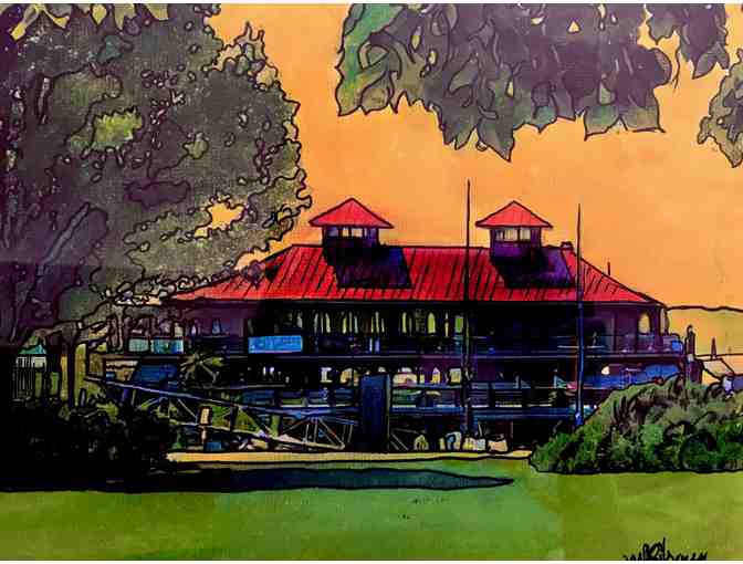 Pastel and Ink, "Boathouse", 11 x 14" matted under glass, silver frame, outside dimensions 16" x 20"