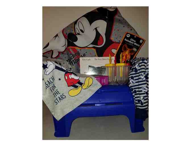 Small toddler chair with Mickey 12 mos pjs; large bag, book and more!