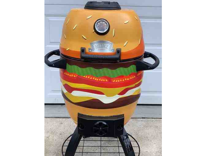 This Broil King KEG 2000 Charcoal Grill is wrapped with a fun hamburger sticker...a great bbq conversation piece!