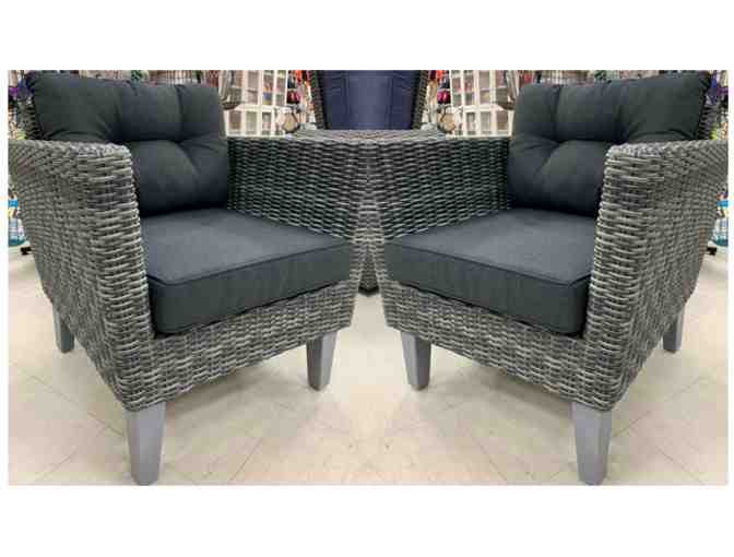 Two Weather Resistant Resin Wicker Chairs with Cushions