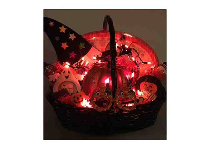 Large black basket with orange lights, tray, wall hangings, pumpkin, four wine glasses and red wine and other goodies for spook-tacular fun!