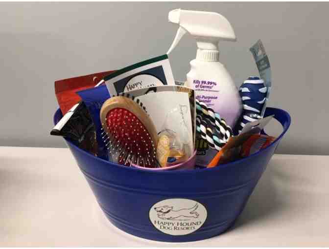 This includes a aift basket from Happy Hounds Dog Resorts - includes a leash, treats, multi-purpose cleaner, toys, brush, a certificate for 2 free nights boarding and 3 one-day daycare certificates.