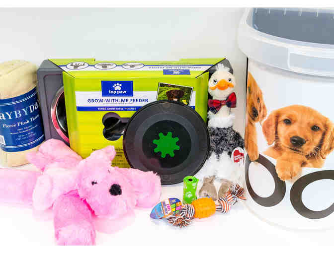 This package contains a brand new dog food container, brand new elevated food, and water bowl set, along with a blanket and a certificate for one FREE pet adoption at JHS!