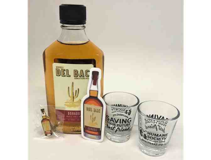 This auction item includes one gift certificate for a tour and tasting for four people at Whiskey Del Bac, one 200ml bottle of Whiskey Del Bac Dorado and two HSSA shot glasses.