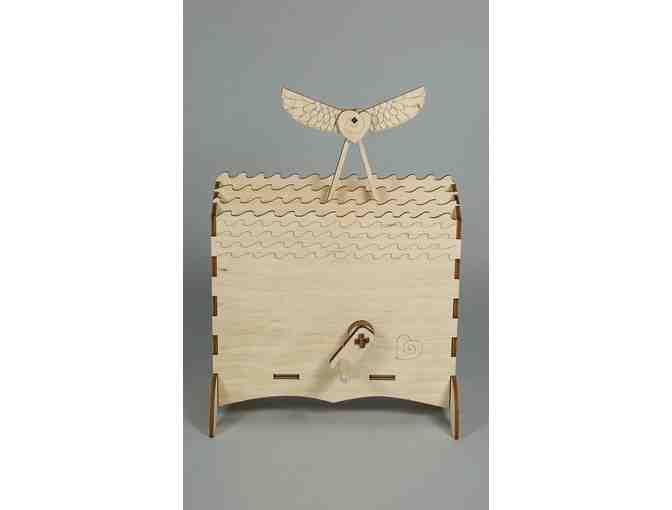Cranky Heart Automata Kits are designed and manufactured by award winning automata artist and North House instructor, Cecilia Schiller. Love Flies Across the Sea has series of interlocking gears that send Love soaring in a random pattern above the waves. This kit is laser-cut from high quality Baltic Birch Plywood and completely manufactured in the USA (no plastic parts or packaging).