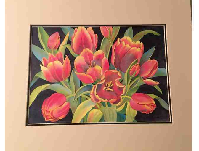 11" x 14" matted watercolor print of an orange tulip bouquet signed by artist Sharon Kane, MHS alum!