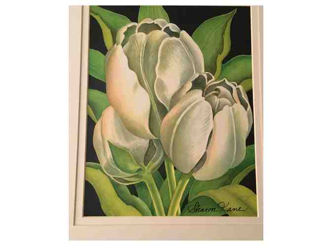 11" x 14" matted watercolor print of white tulips and signed by artist Sharon Kane, MHS alum!