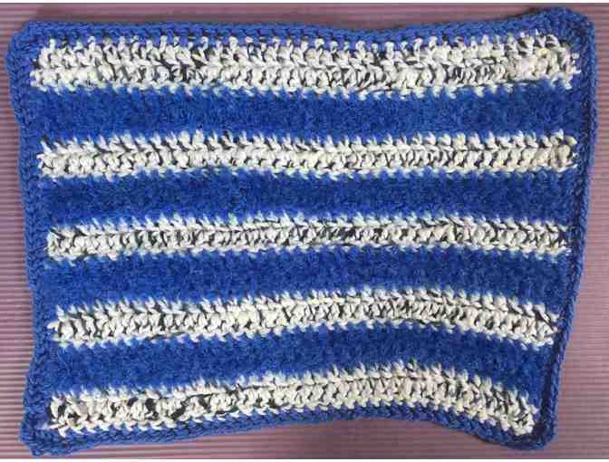 Artist Chaya Poretsky crocheted the baby blanket which is available in blue and white stripes.