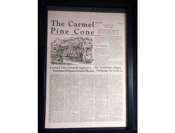 The Carmel Pine Cone Newspaper Dec 1, 1933, in an easily accessible 13 x 19 black frame, so item can be removed and read.