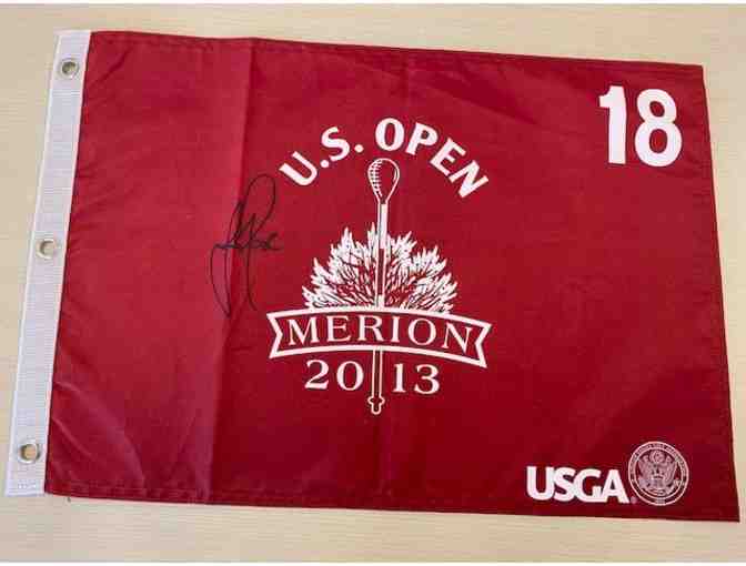 2013 US Open flag autographed by tournament winner, Justin Rose. Package also includes a hat and two golf balls autographed by John Senden. Includes a certificate of authenticity.