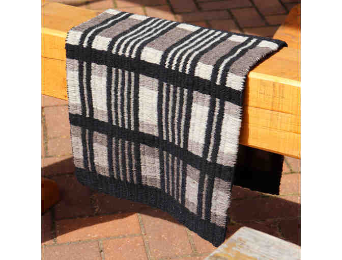 This is a handwoven wool rug measuring 16” x 34”. It was woven using a pattern structure call bound weave. Care for this rug after shaking or using a damp cloth to remove any dirt should be dry cleaning.