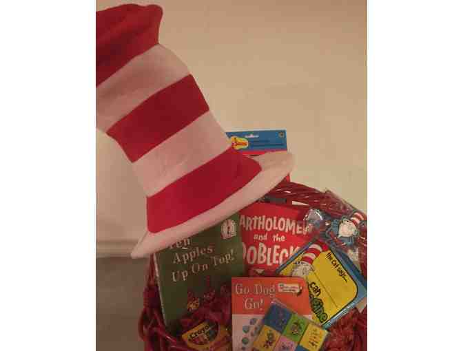 A basket of three Dr. Seuss books: Go Dog Go, Bartholomew and the Oobleek, and Ten Apples Up on Top. Cat in the Hat felt hat with lots more Seuss items!