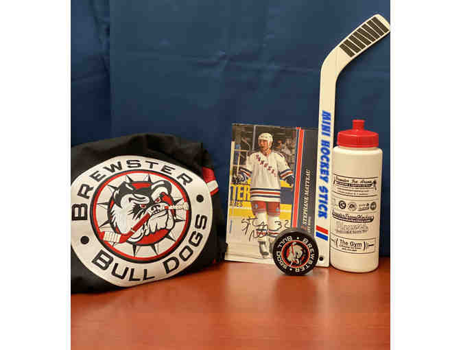 Get ready for hockey season with this package! Includes a Brewster Bull Dogs hockey jersey (S), one mini hockey stick, water bottle, drawstring backpack, hockey puck, (4) free skating sessions at Brewster Ice Arena, one signed New York Rangers Stephane Matteau picture and one picture of New York Rangers Nick Fotiu.