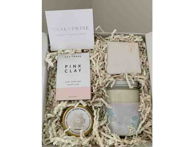 Goat milk soap with basil by Saipua, champagne gummies by Sugarfina, lavendar lip balm by The Honey Hutch, and The English Garden candle with notes of peony, gardenia and lilac by Teak & Twine.